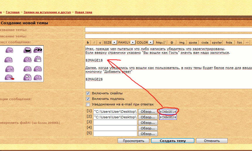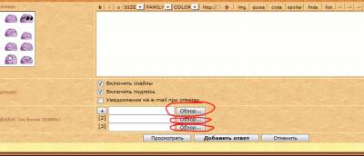 3. Чтобы картинка сама отображалась (а не ссылкой) в тексте сообщения, появившиеся рядом с кнопками "Обзор" теги "имедж1" и т.п. копируем в текст сообщения (в то место где бы вы хотели чтобы была расположена картинка)