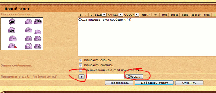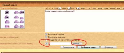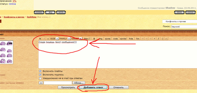 Далее, когда убедились что вошли как пользователь, в низу темы будет белое поле для ввода сообщений. Набрав текст сообщения нажимаем кнопочку "Добавить ответ"